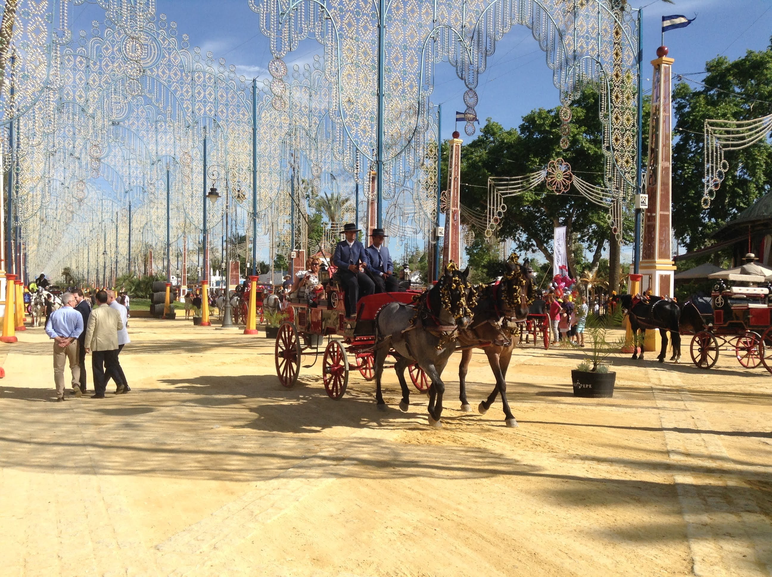 After 2pm daily the main event of the Horse Fair takes place with numerous cavalcades of horses, carriages and riders parading around the Feria ground. The horses are decorated to the highest standard with single riders, horses and carriages, ladies in beautiful dresses and mounted side-saddle behind the men.